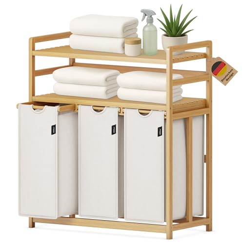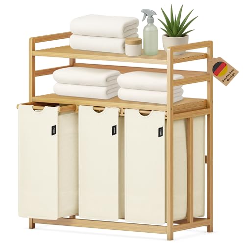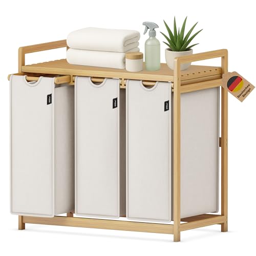 Massido Panier à linge 3 compartiments, 150 l, avec couvercle et sac à linge, en bambou, beige, 61 x 62 x 42 cm