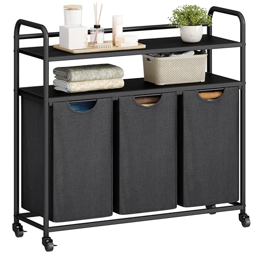 Lifewit Panier a Linge 3 Compartiments Roulettes 120L, Meuble Linge Sale avec 3 Sac à Linge Sale en Tissu Oxford et Étagère en Métal, Bac à Linge pour Buanderie, Chambres, Salles de Bains, Noir