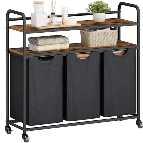 VASAGLE Panier à Linge 3 Compartiments, Corbeille à Linge Sale, 3 Sacs Amovibles en Tissu Oxford, Étagère, Cadre en Métal, 3 x 40 L, 92,5 x 33 x 72 cm, Noir d'Encre et Marron Rustique BLH301B01V1