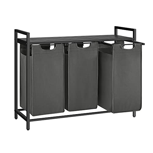 VASAGLE Panier à Linge 3 Compartiments, Corbeille à Linge Sale, 3 Sacs Amovibles en Tissu Oxford, Étagère, Cadre en Métal, 3 x 40 L, 92,5 x 33 x 72 cm, Gris Ardoise et Gris Anthracite BLH301G01