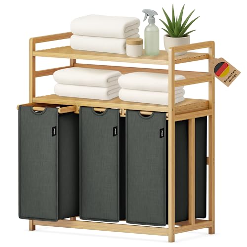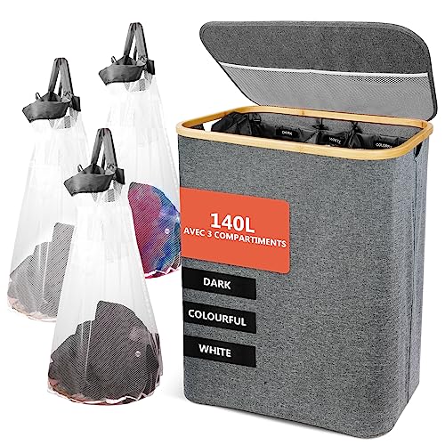 Tiklife Panier à linge 3 compartiments, 150 l, bambou naturel, panier à linge extensible, peut être utilisé dans la cuisine, le salon, la salle de bain et d'autres endroits (gris foncé)