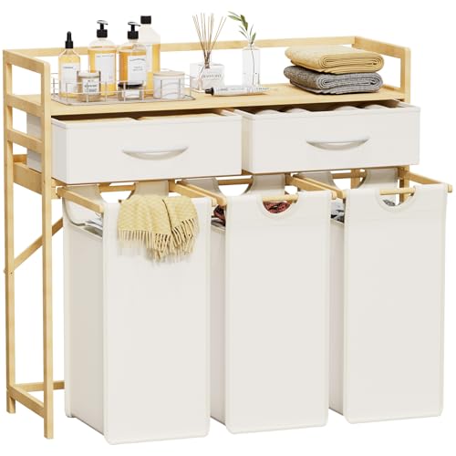Lifewit Panier a Linge 3 Compartiments Roulettes 135L, Meuble Linge Sale Grande avec 2 Tiroirs et 3 Sac à Linge en Tissu Oxford, Bac à Linge pour Buanderie, Chambres, Salles de Bains, Blanc et beige