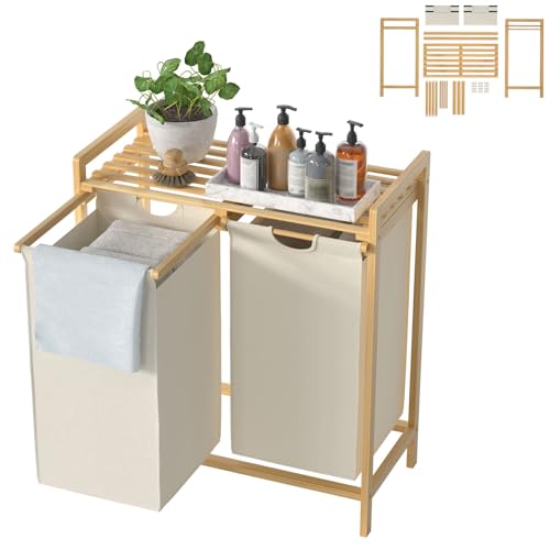UISEBRT Panier à linge en bambou avec 2 compartiments, 72L Trieur à linge en tissu Oxford, système de tri du linge détachable et lavable, 73x64x33,5cm, Beige