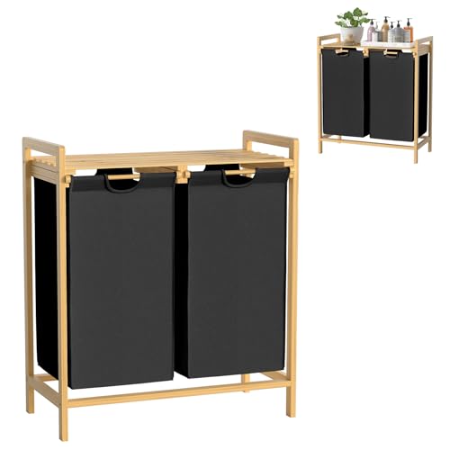 UISEBRT Panier à linge en bambou avec 2 compartiments, 72 l, en tissu Oxford, système de tri du linge amovible et lavable, 73 x 64 x 33,5 cm, noir