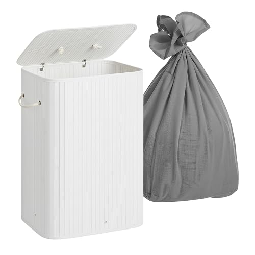 Songmics 100L (62,5 x 52 x 32 cm) laundry basket bamboo foldable laundry box with 2 compartments laundry basket with removable laundry bag.,