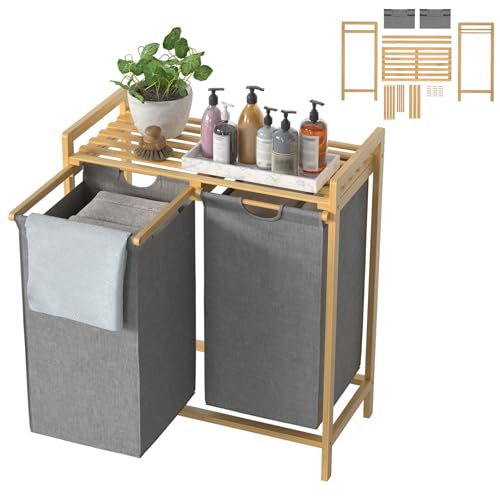 UISEBRT Panier à linge en bambou avec 2 compartiments, trieur de linge 72L en tissu Oxford, système de tri du linge amovible et lavable, 73 x 64 x 33,5 cm, Gris