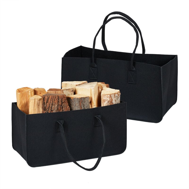 Panier à bûches, lot de 2, feutre, sac de rangement, pour bois de chauffage, 28 litres, avec poignées, noir - Relaxdays
