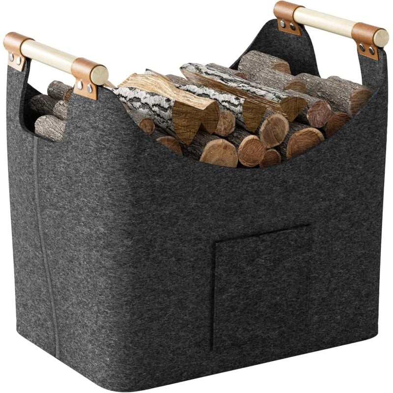 EVOCAMP grand panier à bûches en feutrine pour bois de chauffage et rangement, panier de cheminée XXL en feutrine gris foncé avec poignées en bois, sac à bûches 44x44x30 cm