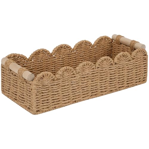 DECOMELODY 2 Pièces Panier de Rangement Tissé Main pour Salle de Bain Panier à Papier Toilette Corde avec Poignées Bois Bordure Festonnée Élégante pour Comptoir ou Étagère