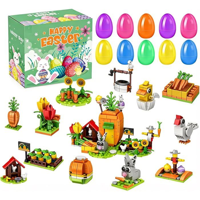 Cadeaux Paques Enfant12 Œufs de Pâques avec 12 Blocs DIY Garnitures de Panier de Pâques et Cadeaux de Fête pour Enfants 6+ Ferme