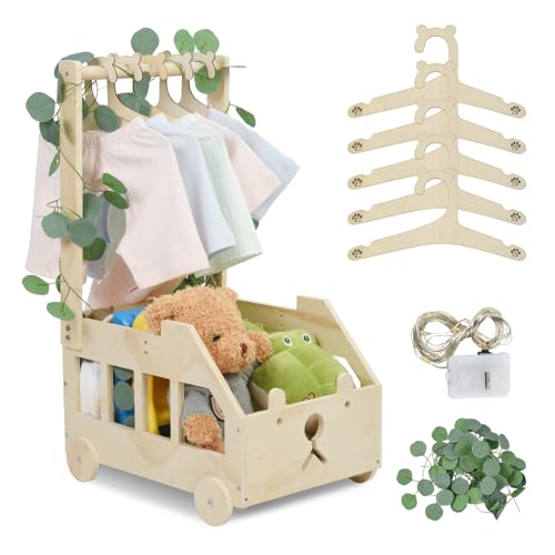OTraki Panier Rangement Bébé avec Roulettes, Panier de Douche Bois pour Bébé avec Feuilles Décoratives 5 Cintres En Bois Caisse de Rangement pour Fête Prénatale pour Grossesse, Nouveaux Parents