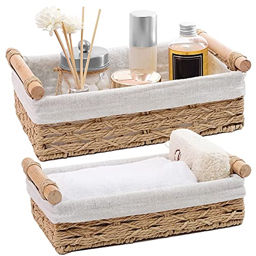 DUOER Lot de 2 paniers de rangement ronds en corde de papier, paniers en osier pour organiser avec poignée, bacs décoratifs pour comptoir, panier à papier toilette pour réservoir de toilette, petits