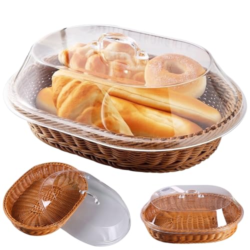 Paniers à pain en osier, panier en polypropylène tissé avec couvercle acrylique, plateau de bonbons de collations rotin ovale pour la nourriture pour restauration la nourriture Famille / 14x10x