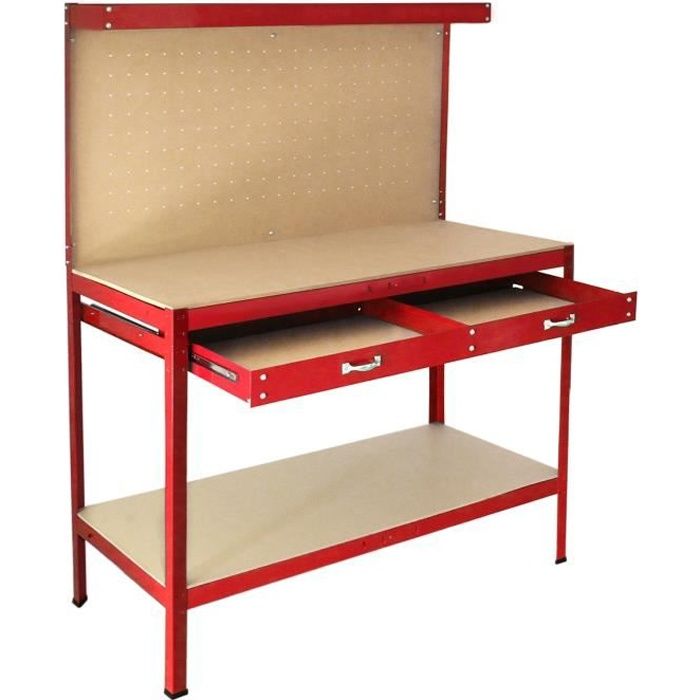 Établi de Travail Rouge Banc Plan de Travail Panneau Perforé Ateliers Rangement Outils avec Tiroir 2 Niveau Étagère Robuste Cadre Sans Boulons