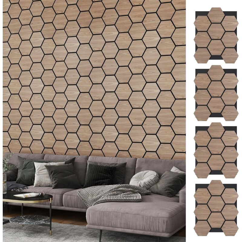 COSTWAY Lot de 4 Panneaux Acoustiques pour Murs, Panneau Absorbant de Bruit 81 x 66 CM avec 9 Plaques de Bois Hexagonales, Décoration Intérieure 3D