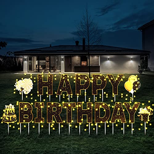 Jetec Lot de 17 panneaux de jardin « Happy Birthday » avec guirlande lumineuse noire pour anniversaire, décoration de pelouse avec piquets « Happy Birthday » pour maison, porche, fête