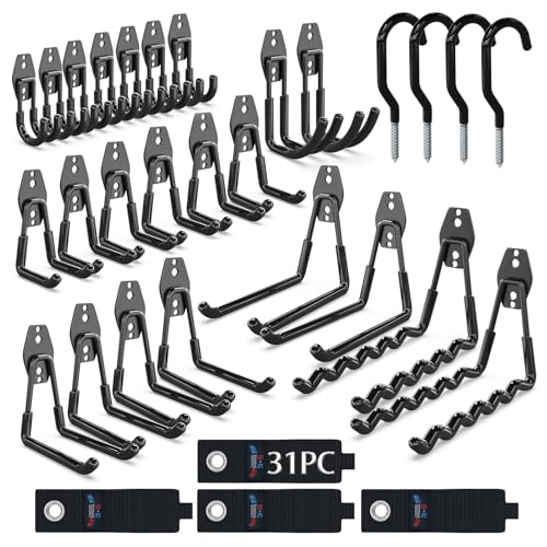 3-H Crochet Mural Garage en Acier Robuste, Revêtement PVC Antidérapant,Crochets Muraux avec 3 Points de Soudure pour Rangement Outils Mural, Échelle, Vélo,Tuyaux,Outil électrique,31pcs, Noir