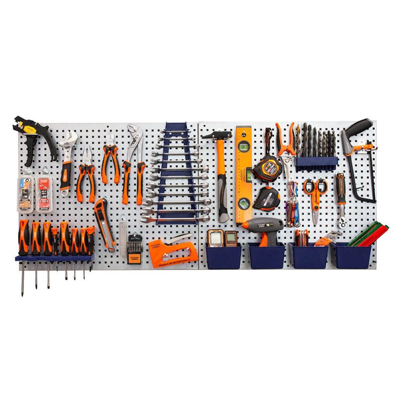 Panneaux perforés modulaires en métal et crochets muraux pour rangement d'outils de garage - Kit combo de panneaux perforés (110 x 23 cm) - Accessoires durables et polyvalents
