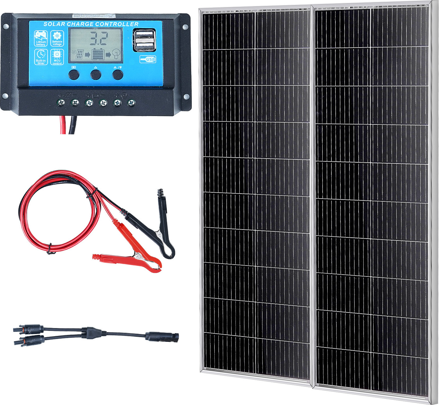 VEVOR Panneau solaire 200W Kit de 2 panneaux solaires monocristallins 12V plus régulateur de charge 16,66A Taux de conversion du système solaire de 23% Compatible avec les batteries AGM, GEL, FLD, LI Idéal pour les camping-cars Yachts Zuh