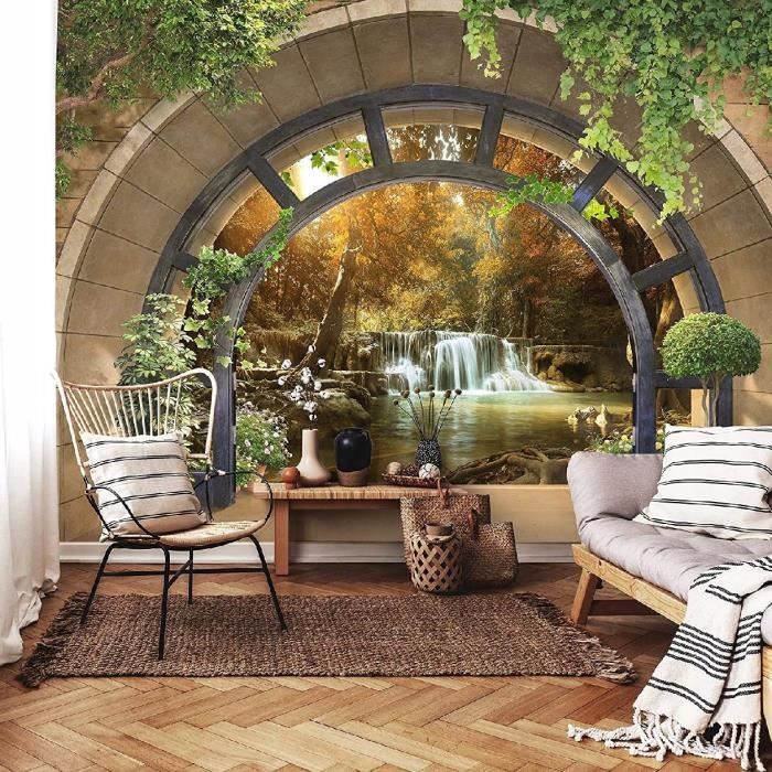 Papier Peint Intissé Fenêtre Panoramique 368x254 cm Cascade 3D Nature Chambre Salon Photo Non Tissé Muraux Trompe loeil
