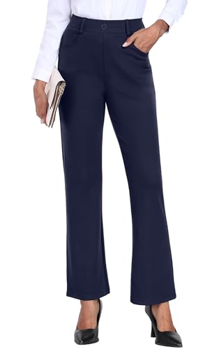 GRECERELLE Pantalon pour femme extensible Pantalon de bureau Pantalon de yoga Taille élastique Pantalon droit décontracté Pantalon de travail pour femme UK Pantalon de yoga avec poches, bleu marine, L