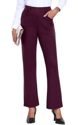 GRECERELLE Pantalon pour femme extensible Pantalon de bureau Pantalon de yoga Taille élastique Pantalon droit décontracté Pantalon de travail pour femme UK Pantalon de yoga avec poches, rouge vin, S