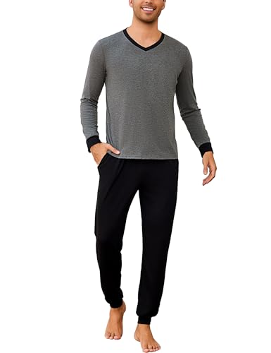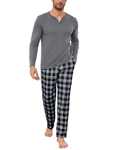 Bresdk Pyjama Homme Hiver Coton Col V Chaud Ensembles de Pyjamas Long Pantalon de Pyjama à Chevilles Deux Pièces M Gris Noir