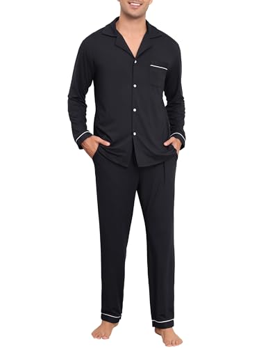 Wikoan Pyjama Hiver Homme Ensemble de Pyjamas de Boutonné Chaud Vêtements de Nuit à Manches Longues et Pantalon Pyjama avec Poches Noir S