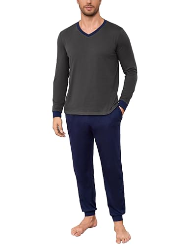 Bresdk Pyjama Homme Hiver Coton Col V Chaud Ensembles de Pyjamas Long Pantalon de Pyjama à Chevilles Deux Pièces M Gris Bleu