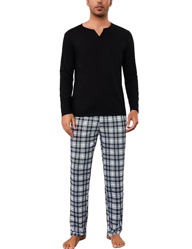Bresdk Pyjama Homme Hiver Coton Ensembles de Pyjama Homme Long avec Poches et Pantalon à Carreaux Vêtements de Nuit Manches Longues Hauts de Pyjamas Noir M