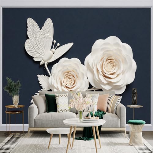 Autocollant mural de taille personnalisée, motif papillon et fleur de rose blanche, papier peint autocollant amovible pour salon, chambre à coucher