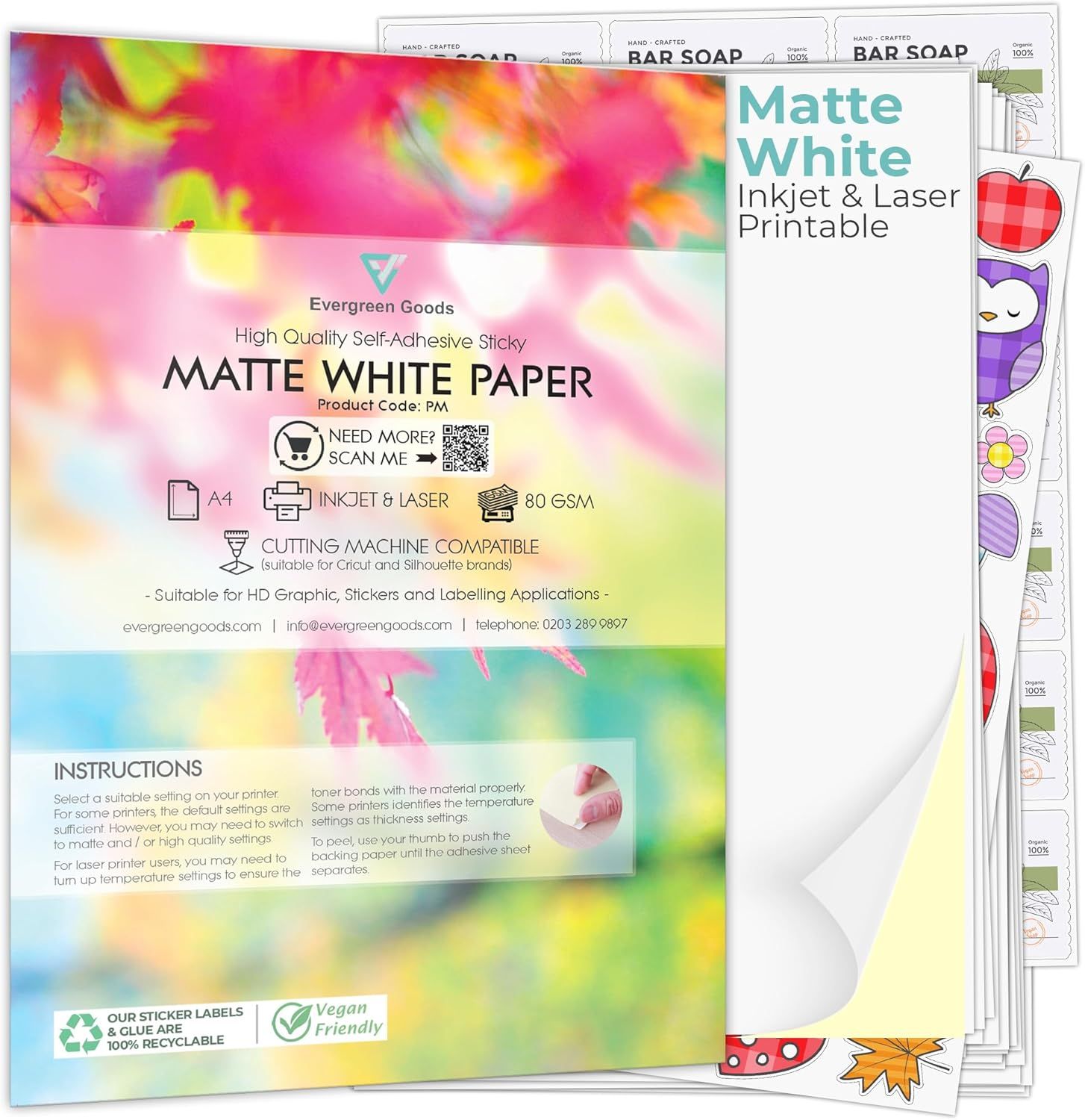Evergreen Goods 100 feuilles A4 de papier autocollant blanc mat, feuilles autocollantes pour impression jet d'encre et laser, papier d'impression pour applications graphiques et d'étiquetage HD
