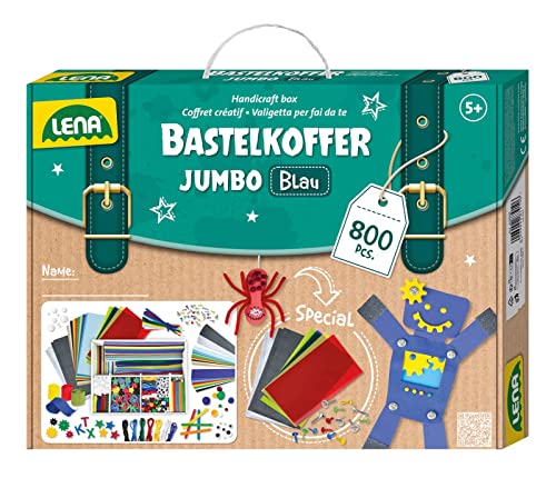 Lena 42665 - Coffret de Bricolage Jumbo avec 800 pièces aux Couleurs Vives, avec de la Mousse, du Papier coloré, des Pompons, des Rubans, des Yeux à Billes, des Manches en Bois, partir de 5 Ans, Bleu