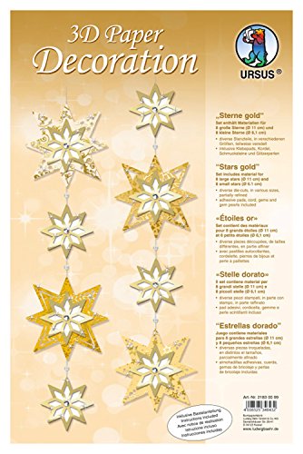 Ursus 21830099 Décoration en papier 3D en forme d'étoiles, dorées, pour 8 grandes et 8 petites étoiles, avec instructions de bricolage (français non garanti), idéal comme décoration de mur, de fenêtre