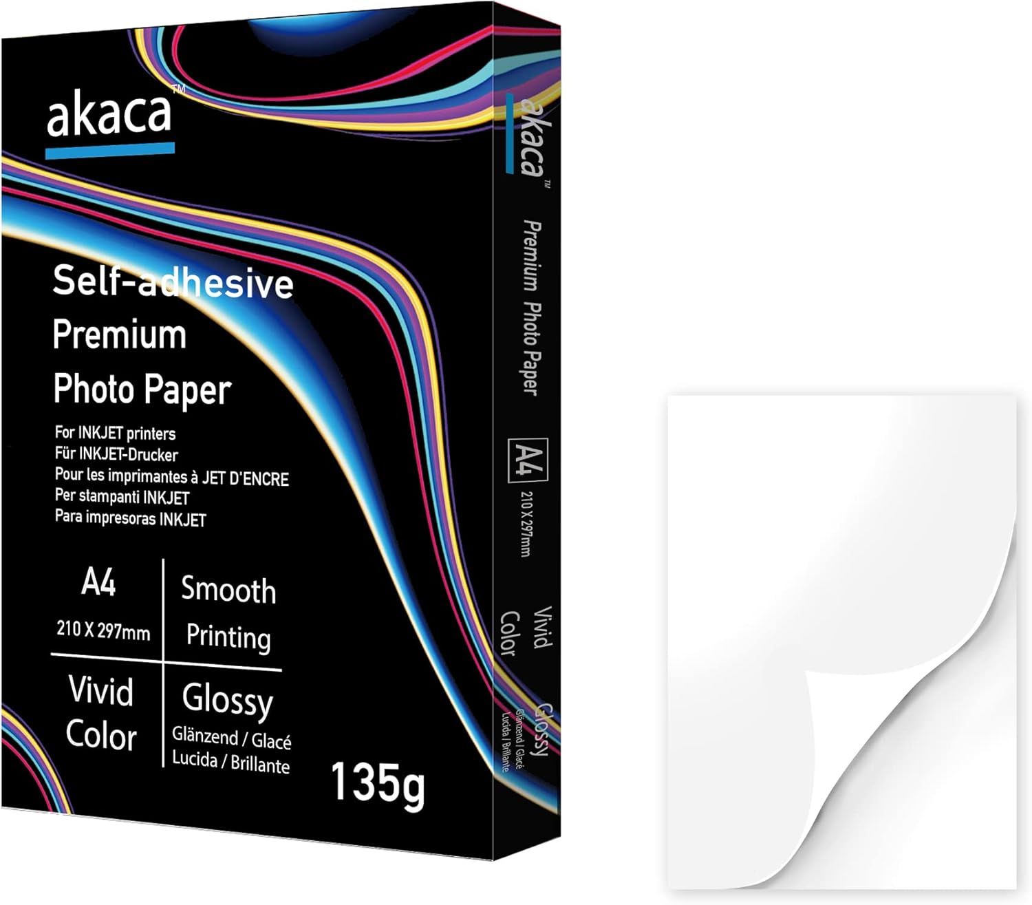 akaca Papier Autocollant Brillant A4, Papier Photo Adhésif, 60 Feuilles, 135 g/m², Papier Collant Imprimable pour Toutes Les Imprimantes à Jet d'encre 210 x 297 mm