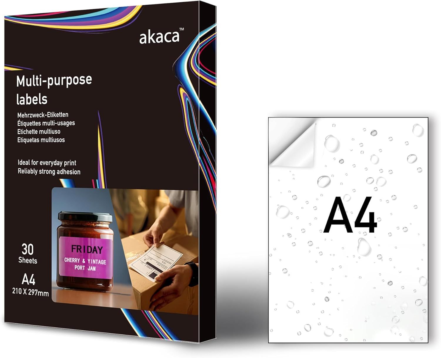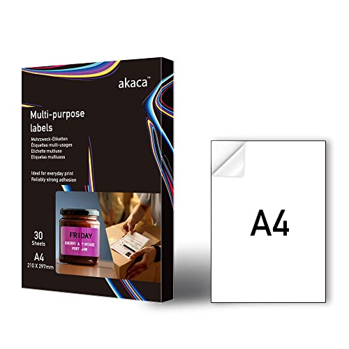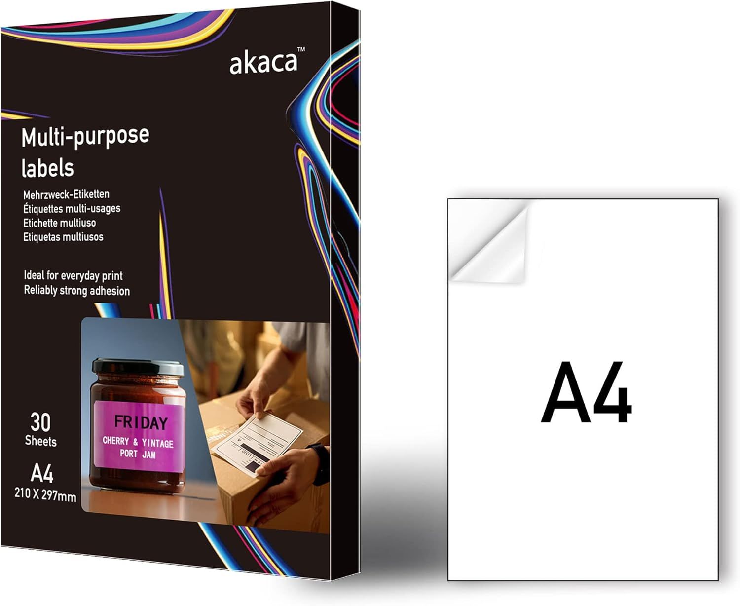 akaca Papier Autocollant Mat Imprimante A4, 30 Feuilles, Étiquette Adhésif Imprimable pour Imprimantes Laser & Jet d'encre, 1 Étiquette par Feuille, 210 x 297 mm