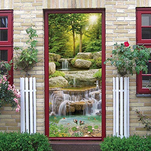 Stickers Porte 3D Trompe L'Oeil 95X215Cm Paysage De Cascade De Forêt Autocollant De Porte 3D Poster Papier Peint Auto-Adhésif Imperméable Pvc Muraux Pour Chambre Salon Cuisine Décoration