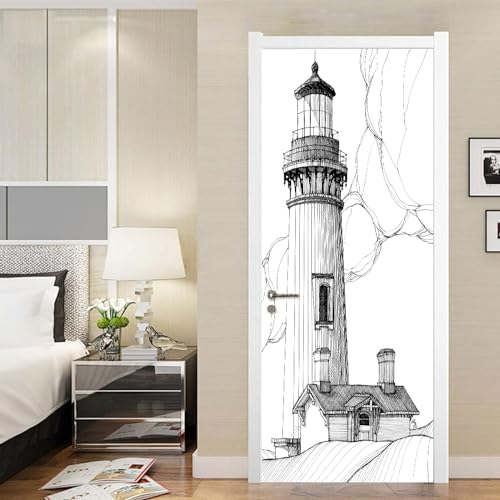 Art De La Porte 3D Phare Noir Et Blanc Autocollant De Porte Poster Papier Peint Mural Autocollant Mural Photo 80 X 200 Cm Décoration De Porte Amovible En Pvc Pour Salon, Chambre, Salle De Bain 0