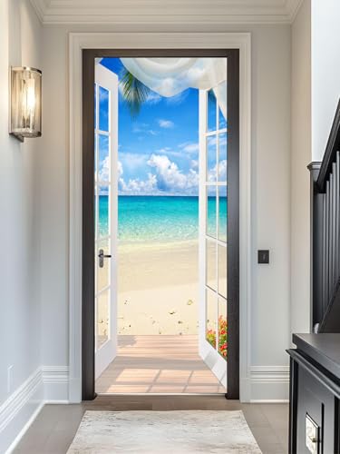 FLFK Autocollant de porte 3D Peler et coller –Balcon océan plage vue mer Papier peint mural autocollant pour porte de maison et chambre à coucher 77X200cm