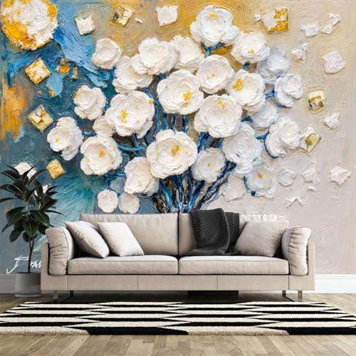 Papier peint mural imprimé en 3D de taille personnalisée, motif floral floral en fleurs blanches texturées, impression artistique sans PVC, papier peint amovible pour décoration d'intérieur