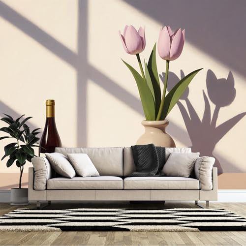 Papier peint mural imprimé en 3D de taille personnalisée, tulipes roses dans un vase, bouteille de vin, ombre claire, impression artistique auto-adhésive (sans PVC), papier peint amovible pour