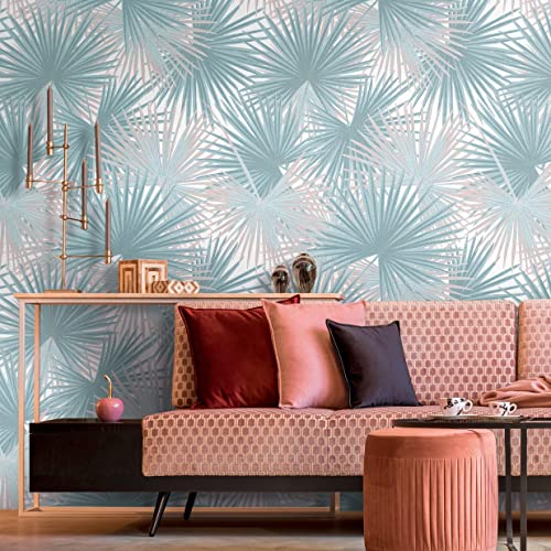 Livingwalls Travel Styles Papier peint non tissé Motif feuille de palmier Bleu et bleu Papier peint mural tropical pour différentes pièces 1,59 m x 2,80 m