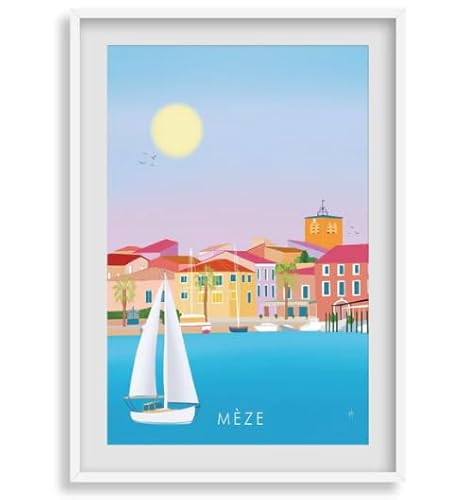 Imagine Affiche- Mèze-Hérault - France - Décoration salon- affiche - Décoration chambre- Style papier peint - méditerranée - souvenir cadeau été -Tableau décoration murale (A4 (21x29,7cm))