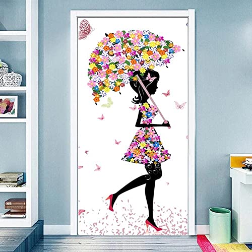 Sticker Porte Effet 3D Fille De Dessin Animé Fleur 95 X 210 Cm - Autocollant Trompe L'Œil Pour Porte - Décoration Pour Porte Cuisine, Salon, Chambre, Salle De Bain - Style Papier Peint Pour Les Murs