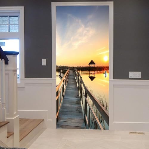 TACOKI Sticker Porte Paysage Au Coucher du Soleil, Stickers Porte Trompe L'oeil Pont en Bois Autocollant Poster Auto-Adhésif Art Décor Pour Chambre Salon Salle de Bain Papier Peint 77x200 cm v2449
