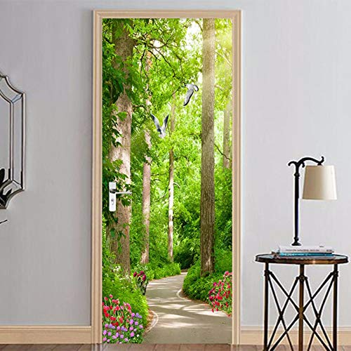 Stickers 3D Porte Poster Paysage De Chemin De Forêt Verte Créatif Papier Peint Porte Trompe L'Oeil Pour Salon Chambre Décoration De La Maison Stickers Muraux Imperméable Stickers Amovibles 77X200Cm
