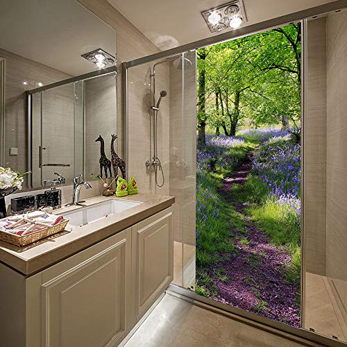 Sticker de Porte Trompe l'oeil Effect Fleurs de La Forêt Et Paysage D'Herbe Intérieure Papier Peint Peintures Imperméable Amovible Autocollants Escaliers 88x200cm