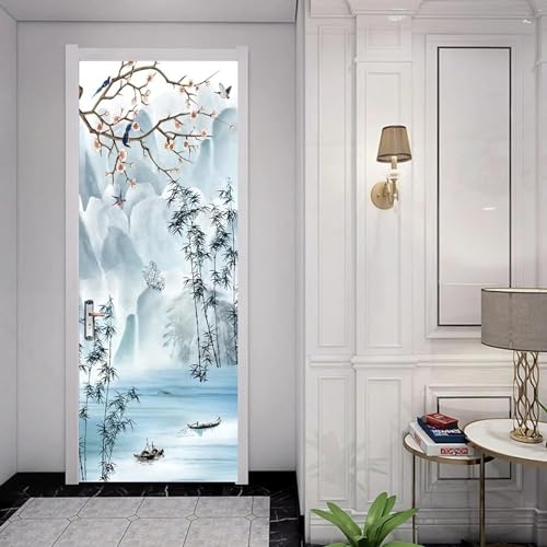 Sticker Porte Style Chinois Papier Peint Porte Paysage Bambou 3D Stickers de Porte Trompe l'Oeil Autocollant de Décoration pour Porte Mural Salon Chambre Poster Porte 95x210 cm 7411m