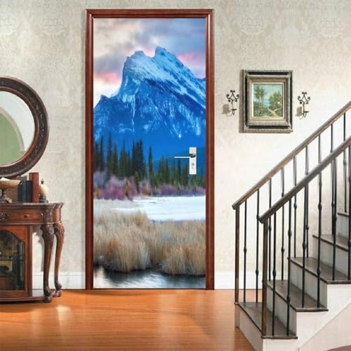 Sticker Porte Des Bois Papier Peint Porte Paysage de Montagne Enneigé 3D Stickers de Porte Trompe l'Oeil Autocollant de Décoration pour Porte Mural Salon Chambre Poster Porte 90x200 cm a.528