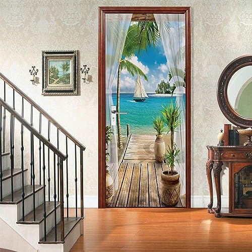Tizhweqo Stickers Porte Trompe L'oeil Plage Paysage Marin Tropical Papier Peint Autocollant Porte Pour Chambre Salon Décoration Stickers Muraux Sticker Porte 77x200 cm a6112